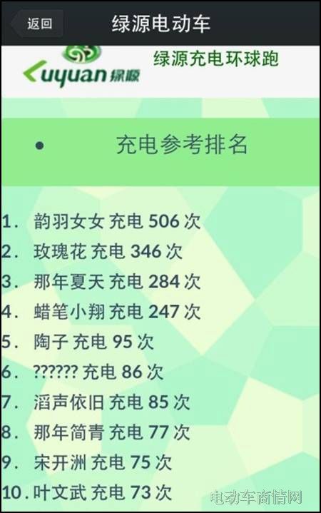 506次,这是网友“韵羽女女”参加绿源充电环球游活动截止到目前的充电人数,看来此人的“充电党”队伍不容小觑,两天时间就已经冲出宇宙了,来势凶猛,看来完全是为“电动车大奖”而来的,目标明确啊,不得不防,当然落在后面的参加者们也不要灰心,后来者居上也不无可能,“车”落谁家还不一定呢。
