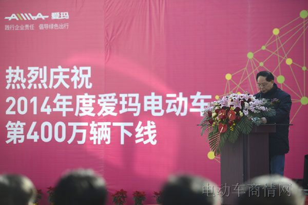 12月22日上午,爱玛电动车在无锡工厂,举办”2014年度第400万辆下线仪式暨江苏爱玛二期工厂落成投产典礼“。锡山区陈建清副区长、中国自行车协会理事长马中超、爱玛科技股份有限公司董事长张剑发表重要讲话。江苏省自行车电动车协会理事长陆金龙、天津自行车电动车协会副秘书长张浩、国家轻型电动车及电池产品质量监督检验中心所长吴建国等相关领导列席参会。江苏卫视、南京电视台、扬子晚报、现代快报、新华网、人民网等20多家媒体,见证了现场盛况。