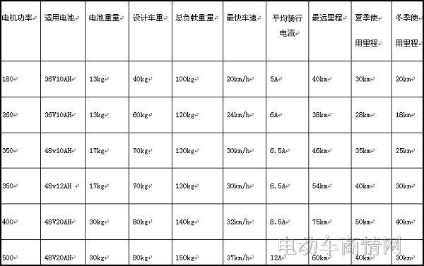 另外,下表是几种常见电动车对应负载(人重60kg)的电动车指标表,需要注意的是,48v10AH和48v12AH的各项重量一样,说明电池的重量只是一个大概的标准,却不是绝对标准,仅供电动车新手参考用。