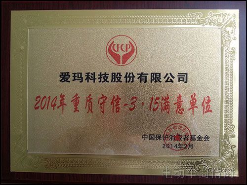 中国保护消费者基金会授予爱玛“2014重质守信——3.15满意单位”荣誉称号以表彰爱玛在树立行业规范、诚信为民、引领行业健康发展等方面所起到的标杆示范作用,这是消费者对爱玛最大的认可与肯定,爱玛期待更多的消费者加强消费品质意识和社会监督意识,共筑质量大堤,共享和谐社会;加强市场诚信服务建设,提高服务质量整体水平,逐步在全社会形成诚实守信、操守为重的良好风尚。