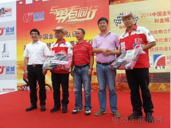 世纪鸟电动车董事长刘宇兴(右二)向参赛车手赠送出征装备