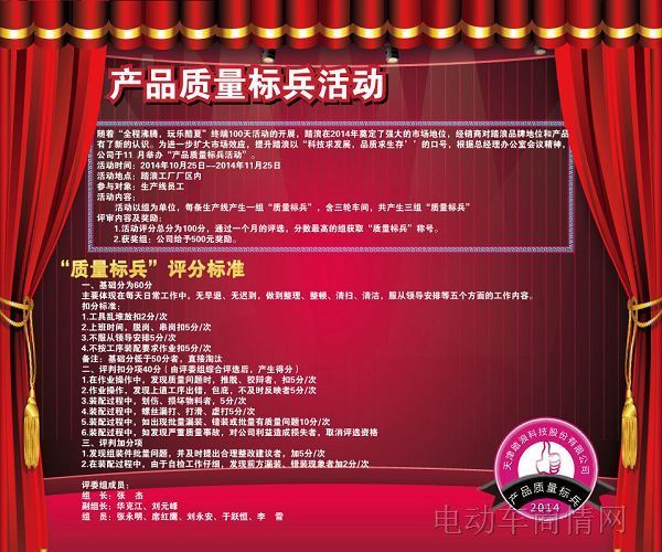 踏浪科技“产品质量标兵评选活动”的目的,主要是提升生产一线工人对工作负责的态度以及对产品质量的重视程度,从而杜绝产品质量问题发生,阻止不合格产品流入市场。在活动中,踏浪科技从产品源头抓起,生产、检验、包装、运输,每一个环节都严格化标准化;从原材料入厂检验、产品各部件检验、整车检验、动静态检验、出厂检验等各种产品质检环节,全方位为产品品质护航;提倡在生产过程中的自检、互检,做到产品质量问题第一时间发现、第一时间解决,把“科技求发展、品质求生存”真正落实到实处。