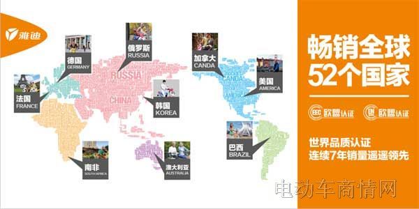 据了解,雅迪在2001年通过ISO9001:2000国际质量体系认证、2007年荣获 “中国驰名商标”荣誉称号, 2009年荣获中国质量万里行全国产品质量、服务质量双满意示范单位及“最受消费者喜欢的电动车品牌”,2014年获得“消费者最信赖品牌”,连续8年销量领先,连续5年入选轻工业行业十强并名列前茅,连续2年获得“销售量、销售额、市场占有率”三项第一,产品畅销全球52个国家,成为名副其实的全球领导品牌。